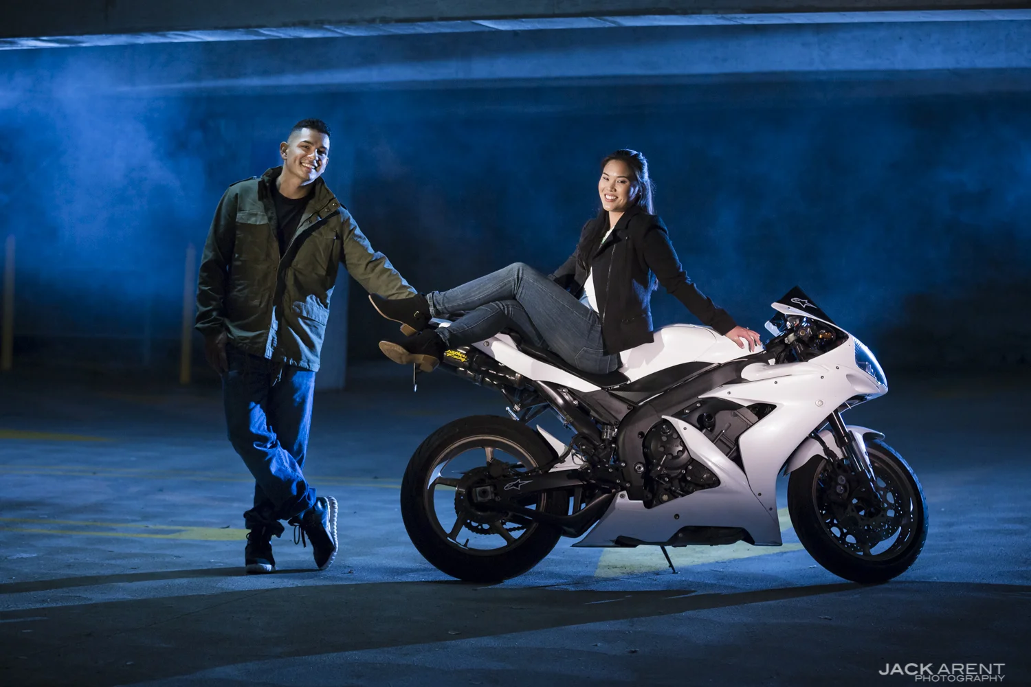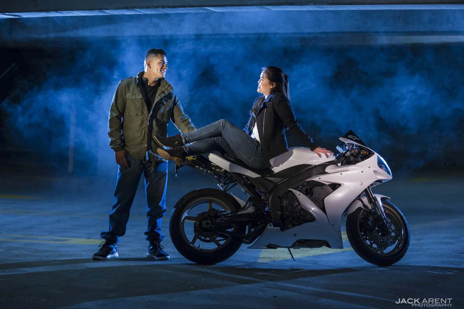 I wanted to use this opportunity to tell Ashley and Omar's story in a different way than usual, they were on board with a motorcycle based photoshoot which would have an engagement feel. I had their trust as to not make their engagement shoot look like I was out shooting a Superbike race at Leguna Seca. I assured them that with special lighting and proper posing their engagement photo shoot would have an edgy and intimate look.