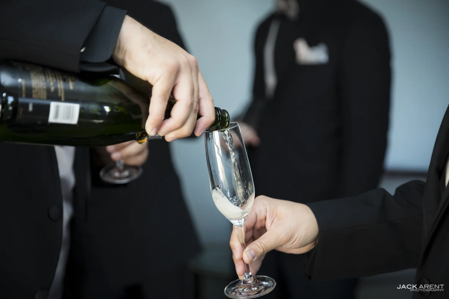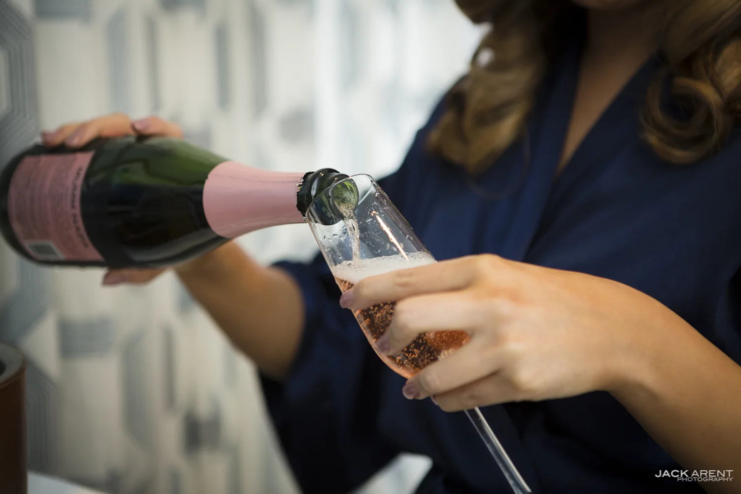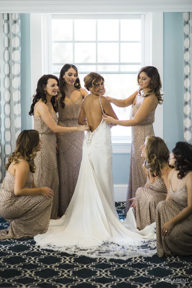 As soon as I walked into the bridal suite at the Claremont Hotel I was greeted by all of the bridesmaids who were literally popping bottles and dancing while hair and makeup were underway.